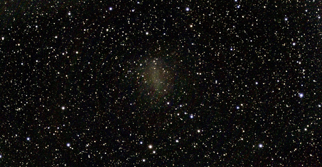 Hier die Beschreibung von NGC 6822 aus Wikipedia: "Barnards Galaxie (auch bekannt als NGC 6822 und IC 4895) ist eine irreguläre Zwerggalaxie mit einer Flächenausdehnung von 15,4' × 14,5' im Sternbild Schütze. Sie ist rund 1,6 Millionen Lichtjahre von unserer Milchstraße entfernt und hat einen Durchmesser von etwa 8.000 Lichtjahren."