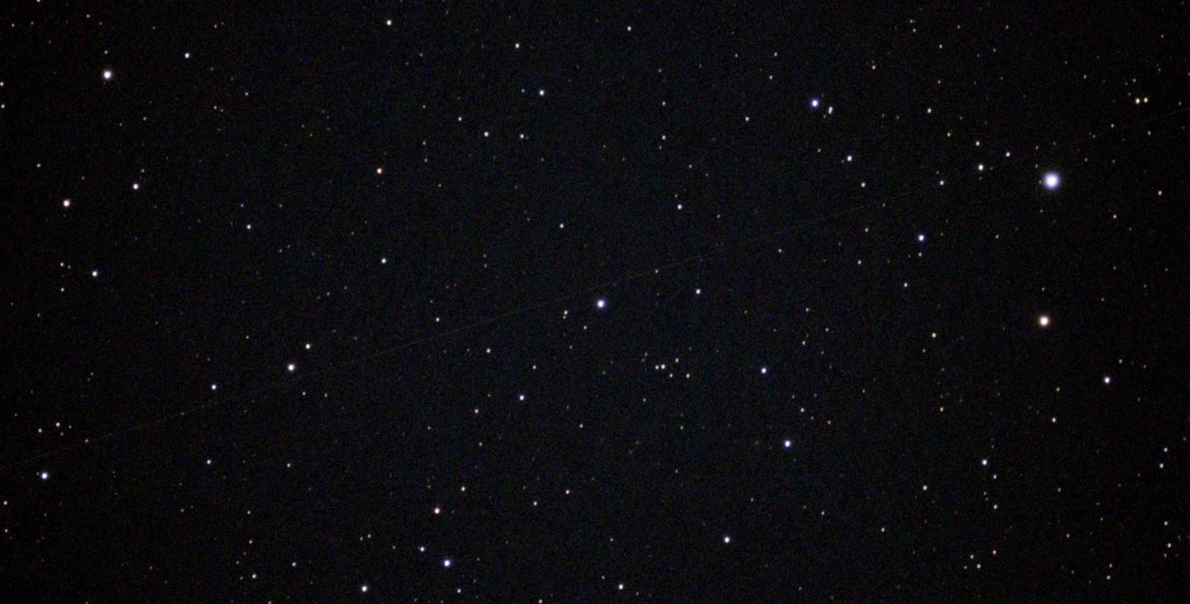 Also habe ich einfach meine Vesperas genommen, auf eine Koordinate mitten aus diesem "Satellitengürtel" eingestellt und dann los fotografiert. Geostationäre Satelliten drehen sich praktisch mit der Erde mit, das heisst sie bewegen sich vor dem Hintergrund des Sternenhimmels. Oder anders ausgedrückt, sie scheinen starr über uns an immer der gleichen Position am Himmel zu stehen.